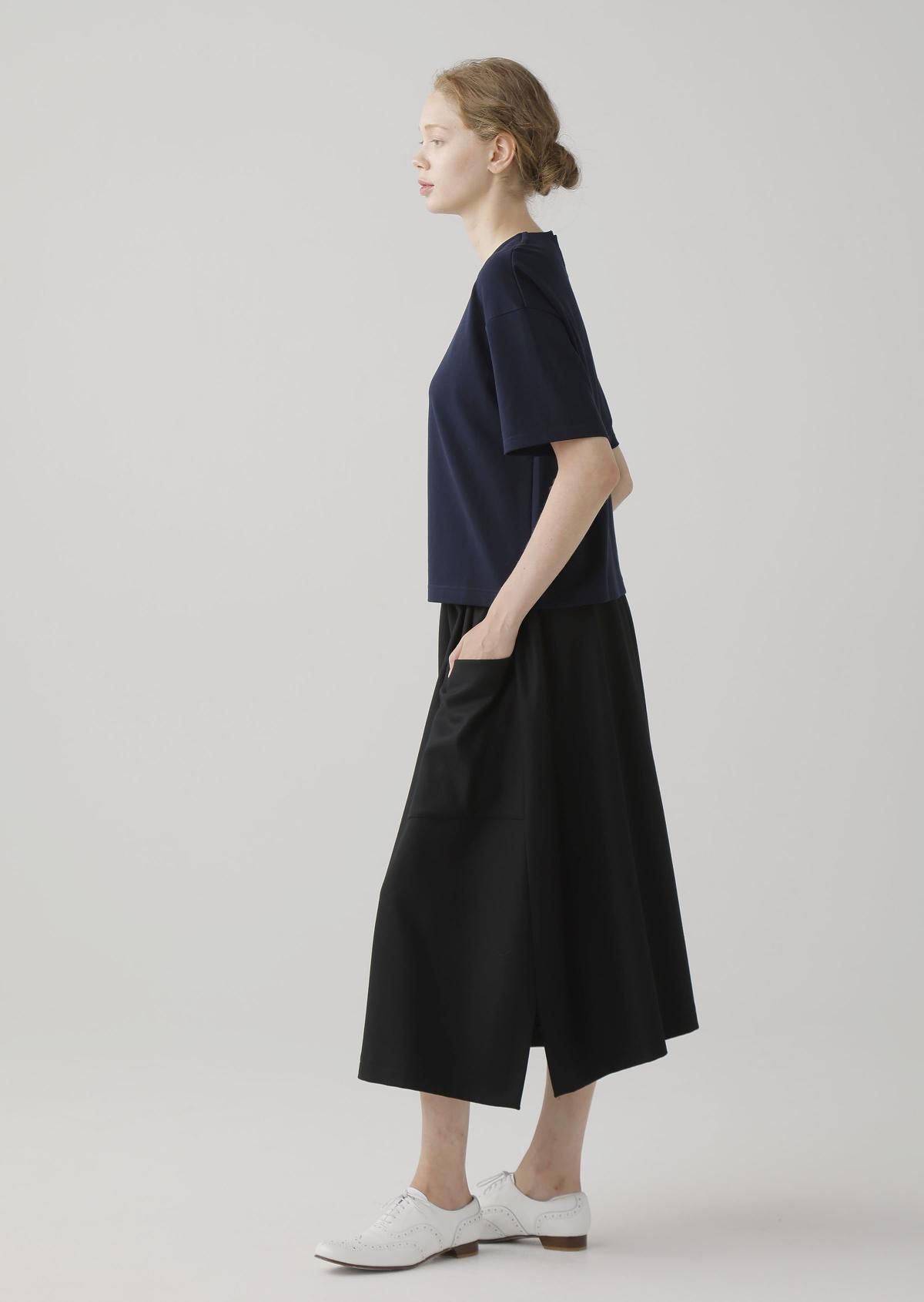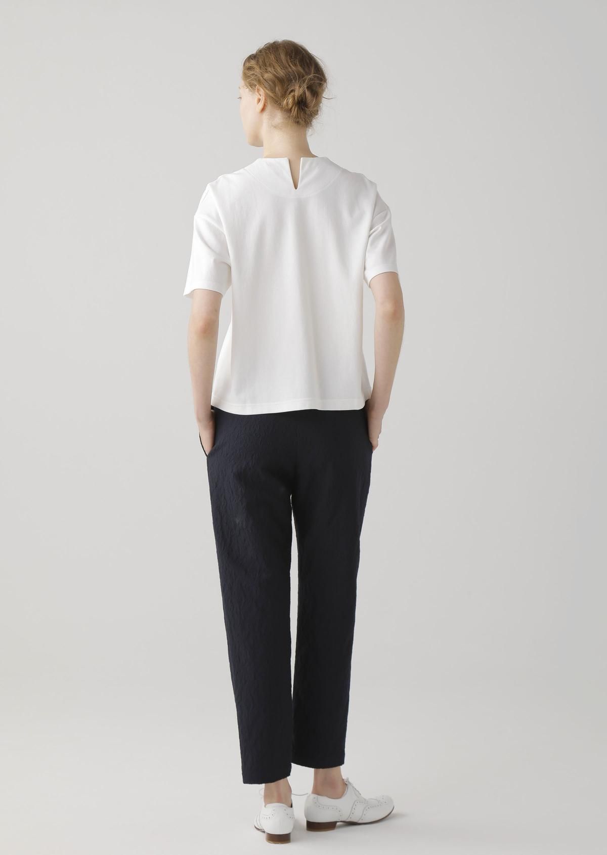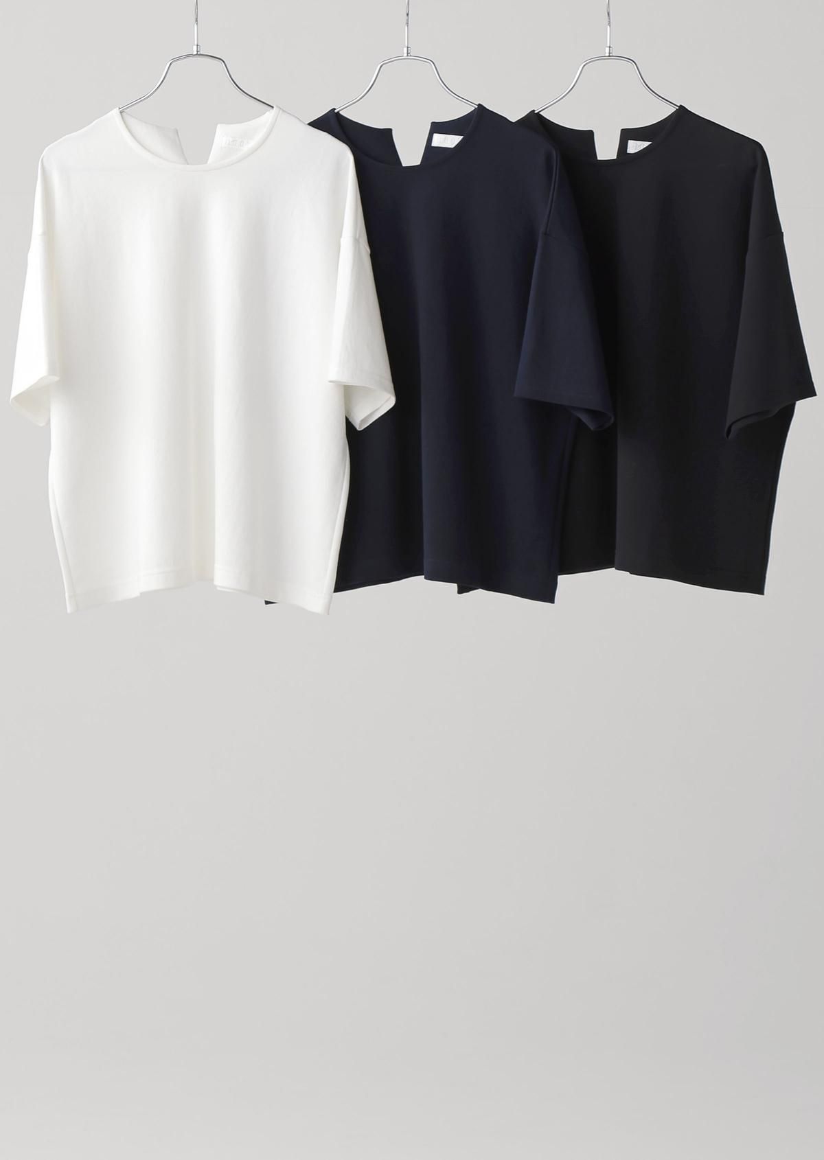 フロントはクリーンなクルーネック、スリット開きの後ろ姿がワンポイントに。