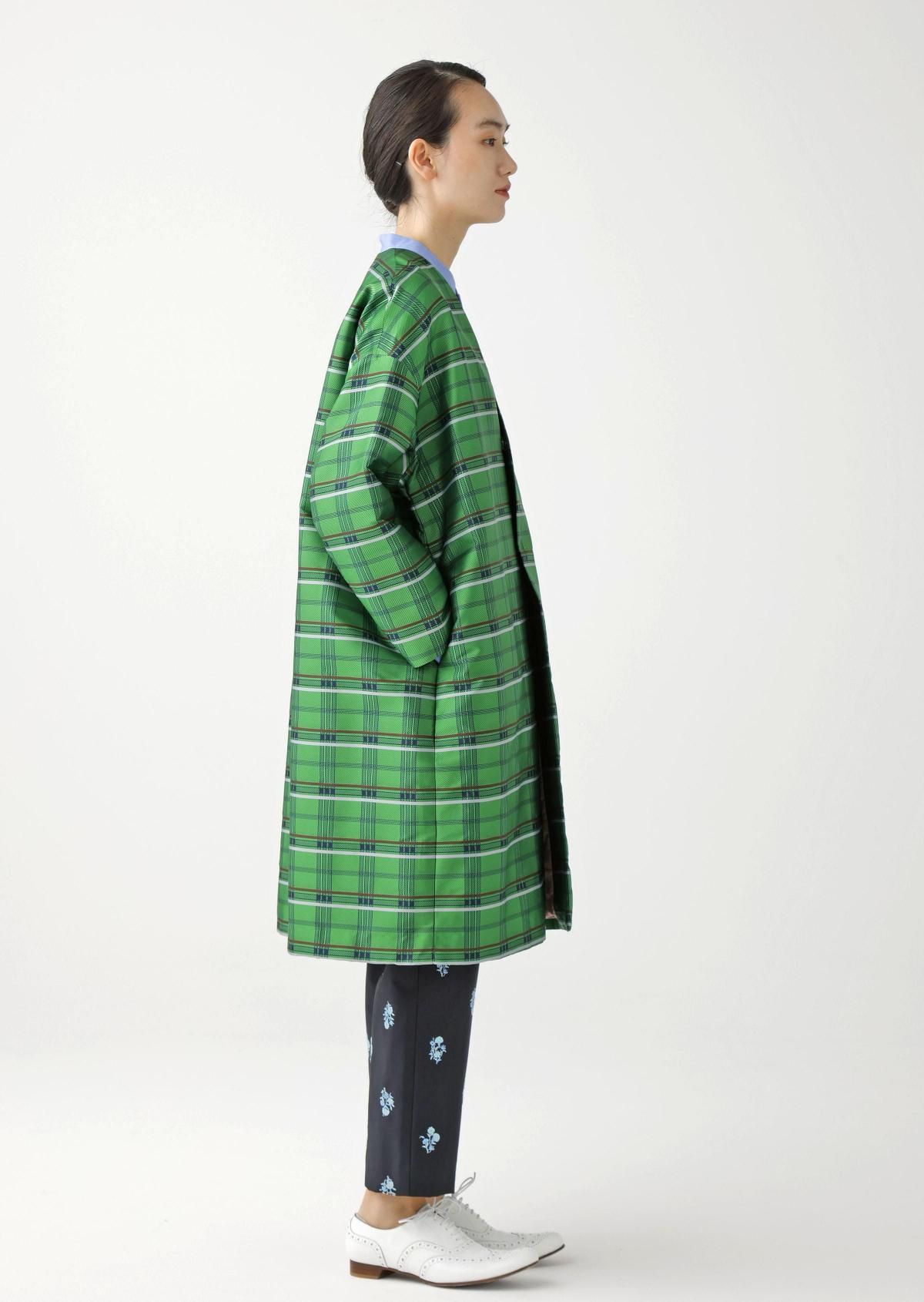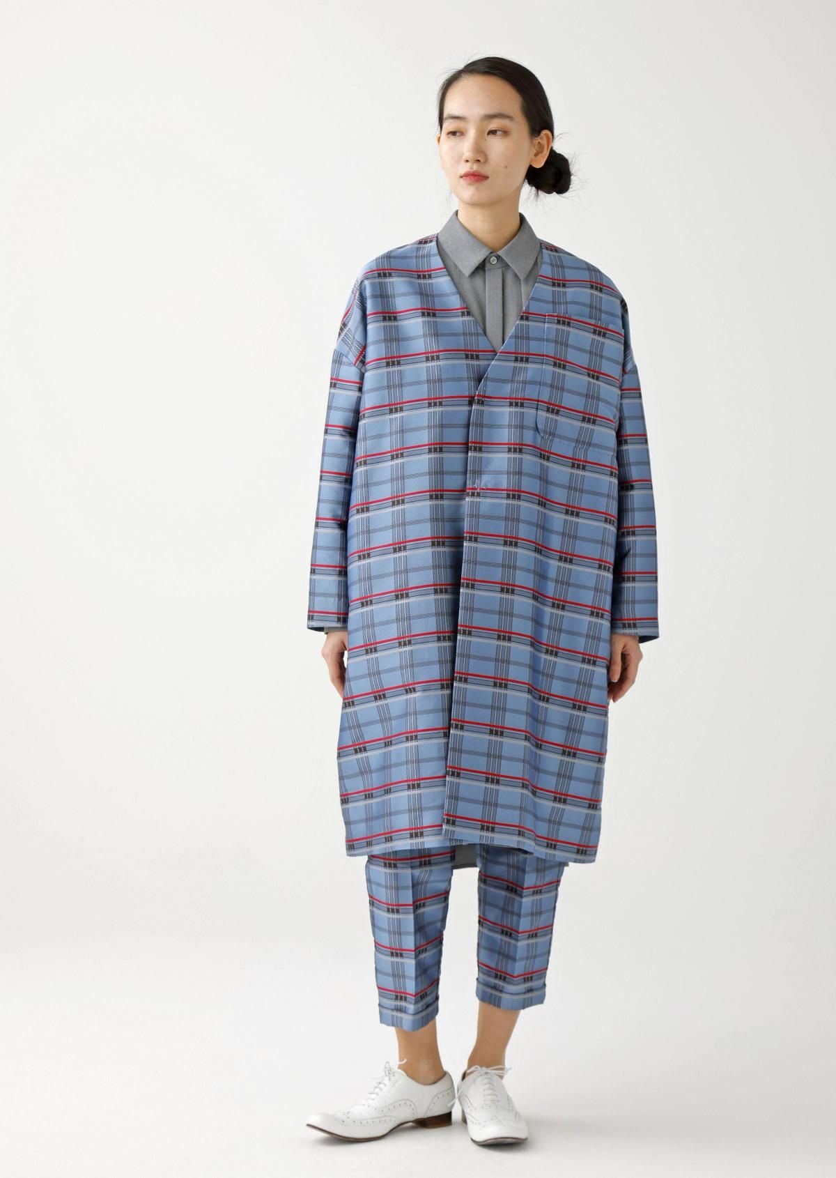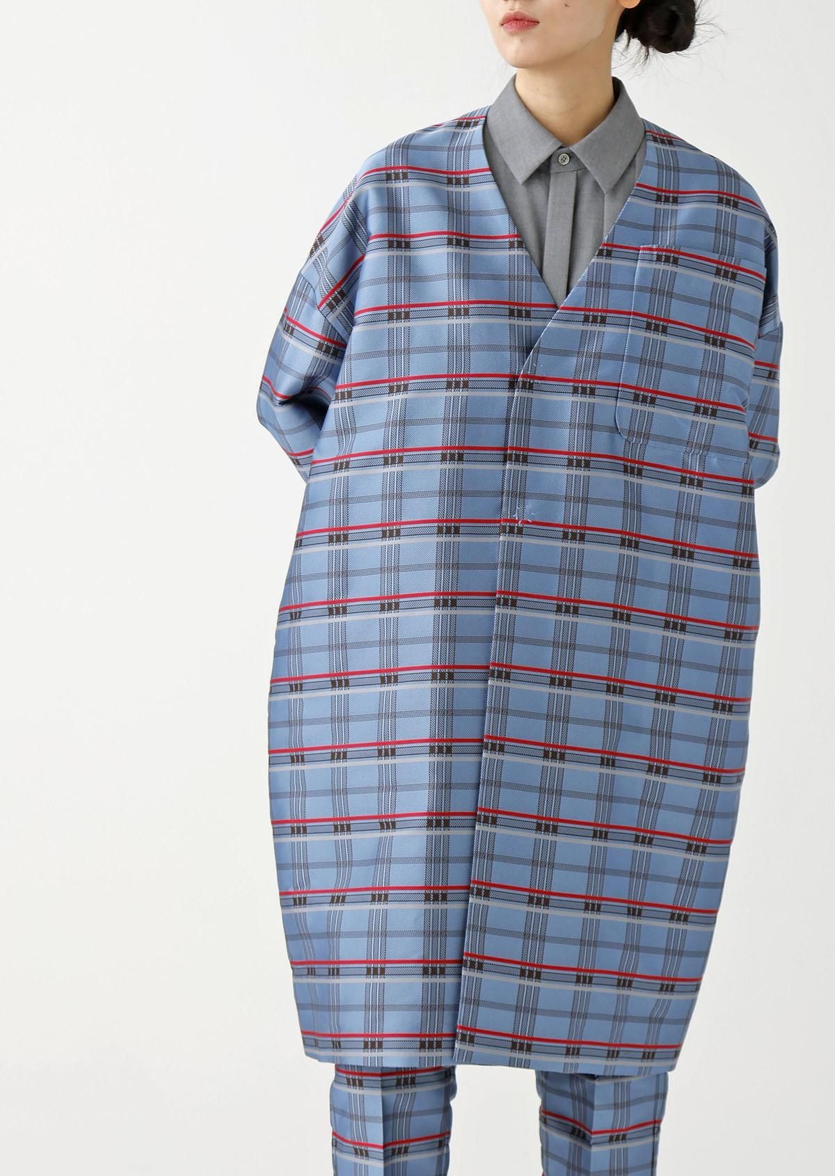 たっぷりと身幅をとり、すっきりとしたノーカラーの胸元に大きなパッチポケットをあしらいました。