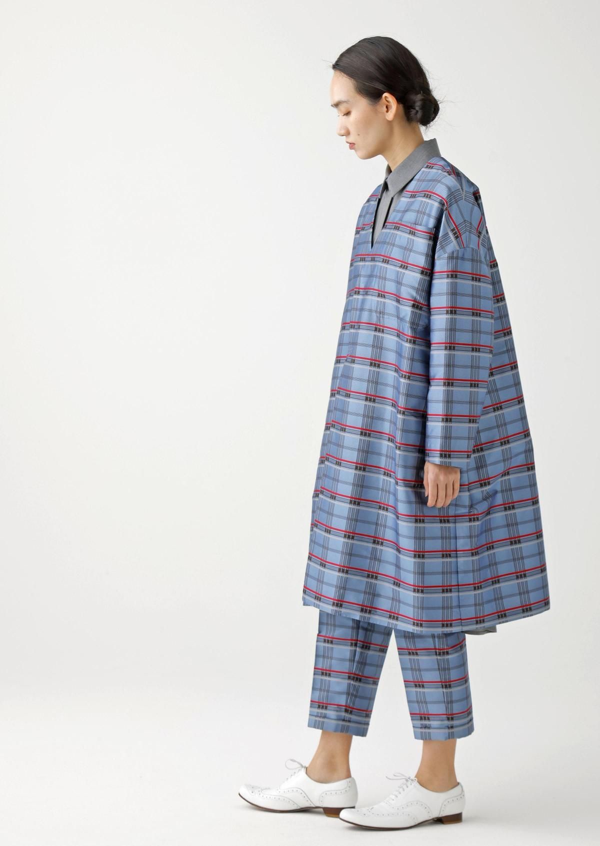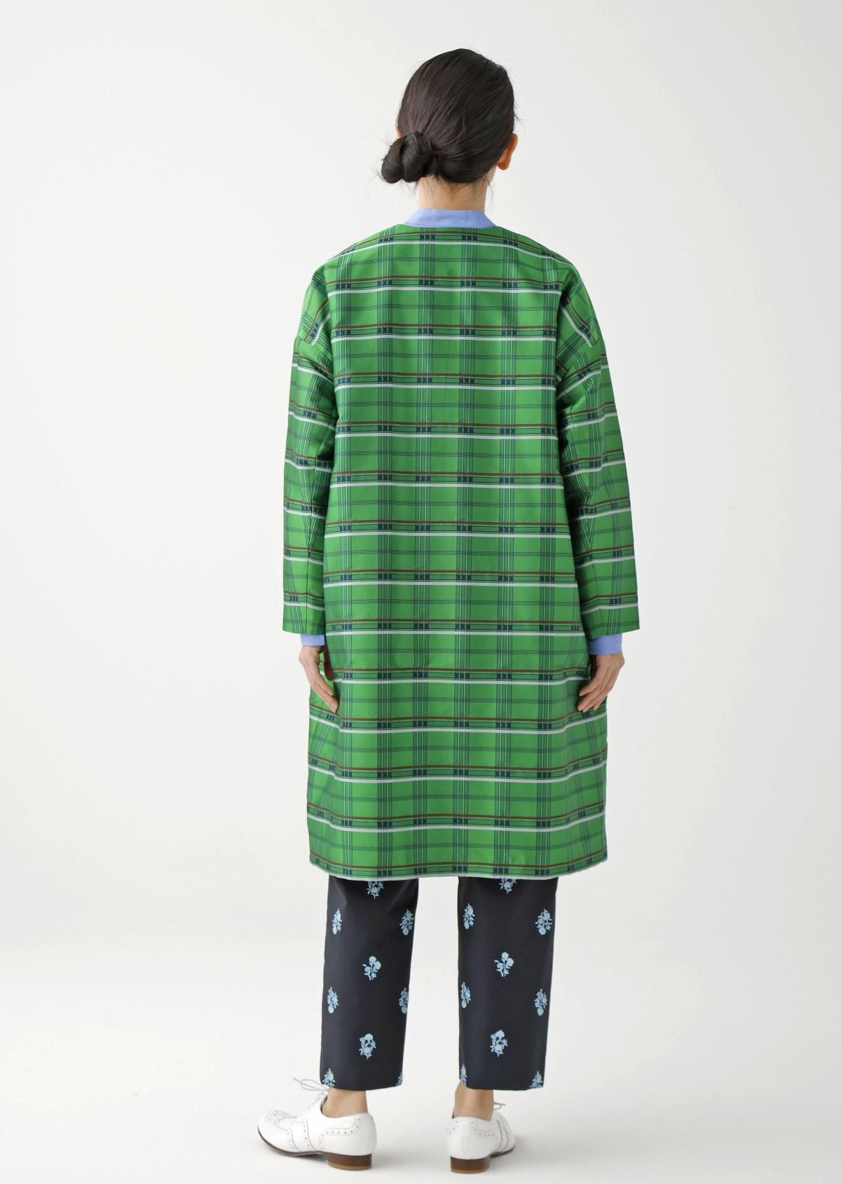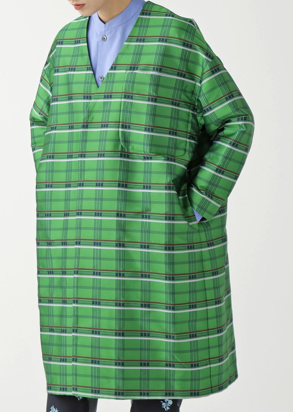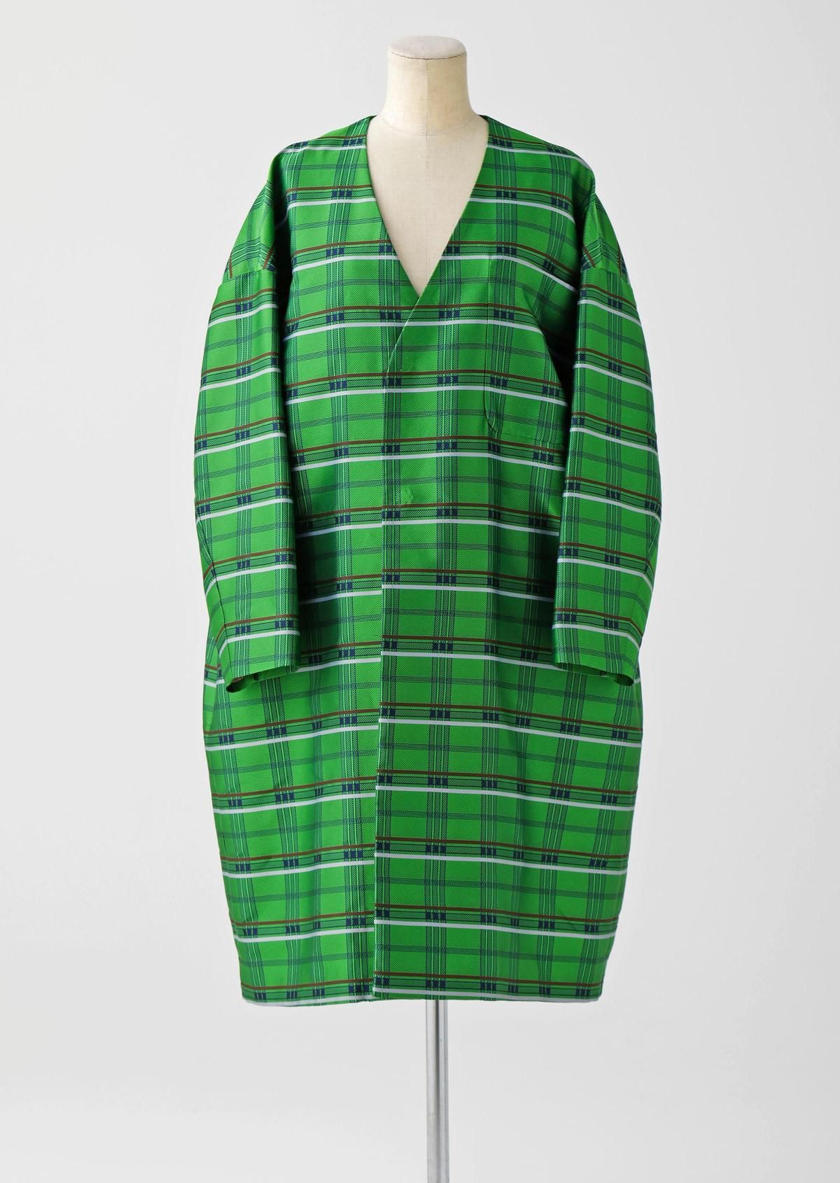 たっぷりと身幅をとり、すっきりとしたノーカラーの胸元に大きなパッチポケットをあしらいました。