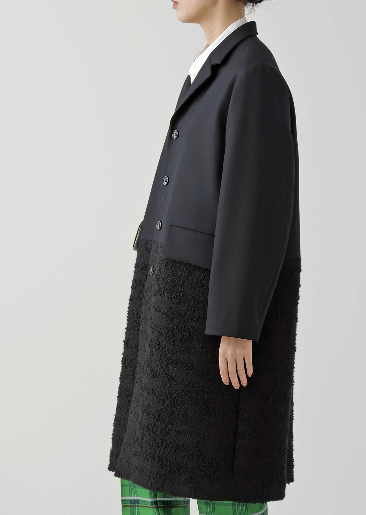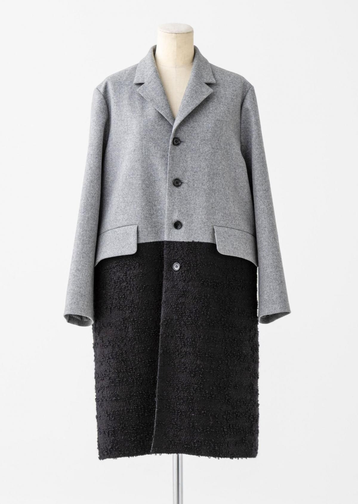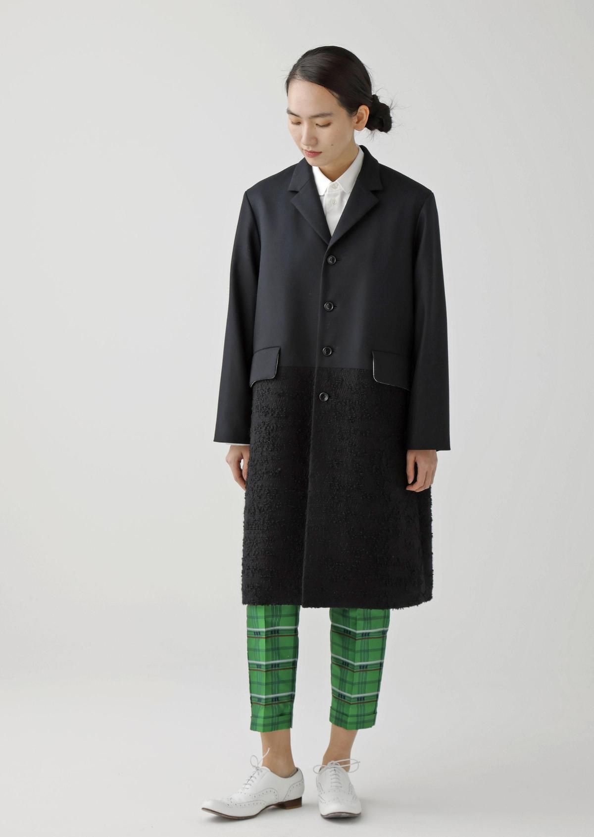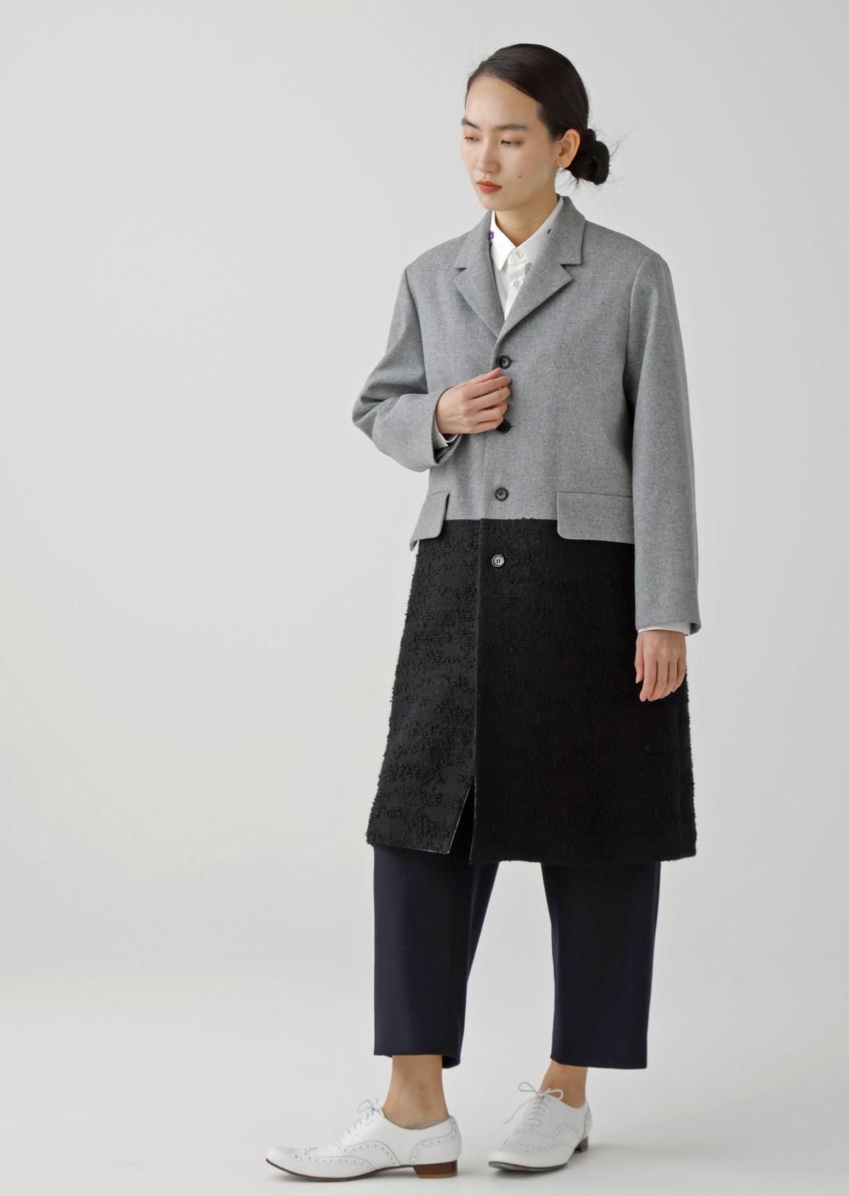表情の異なる生地をコンビネーションしたテーラードコート。