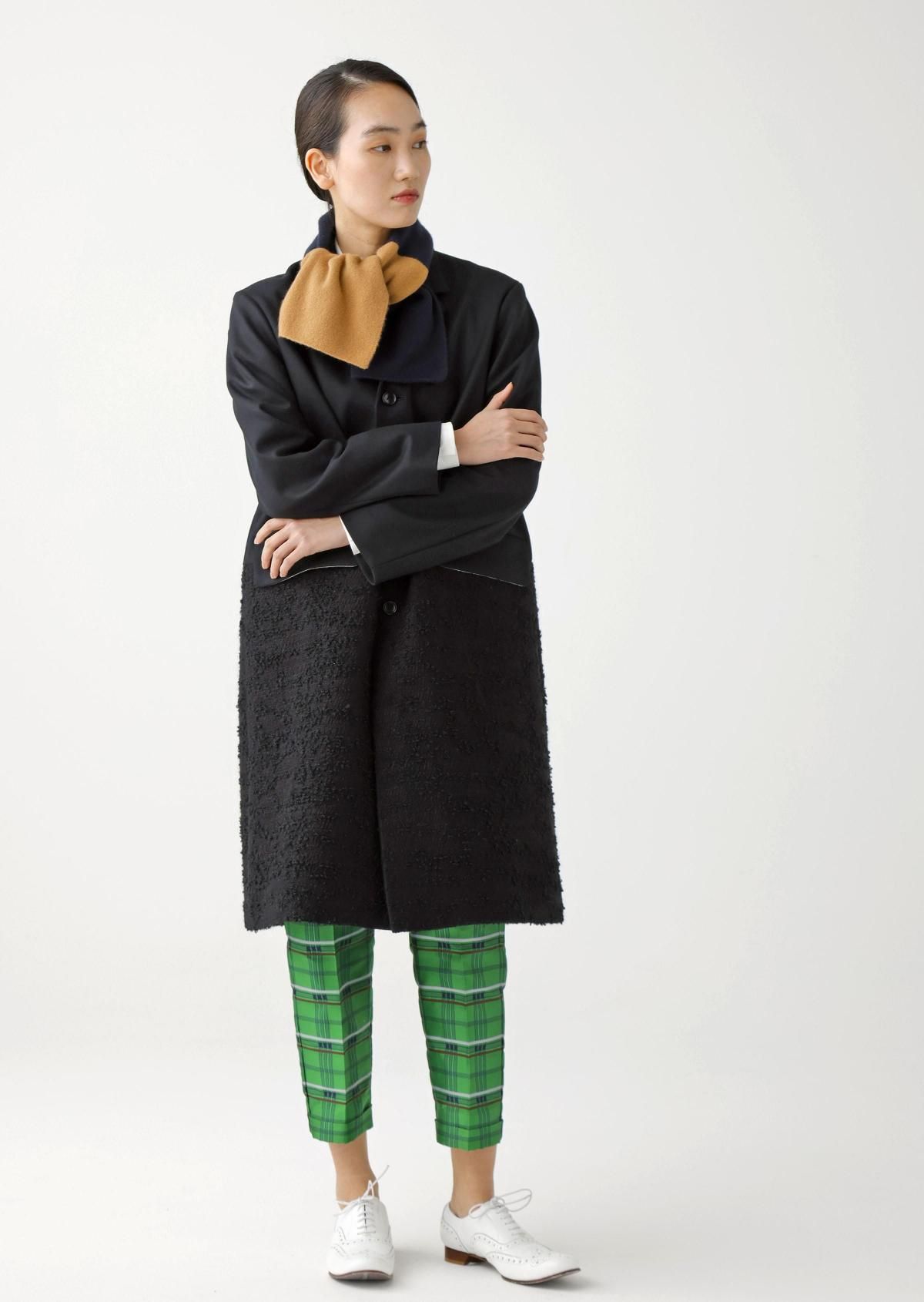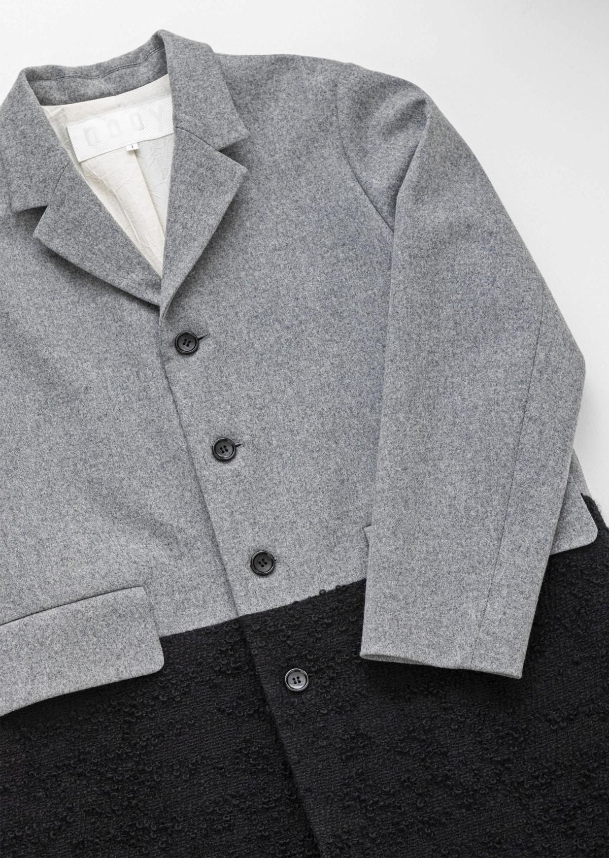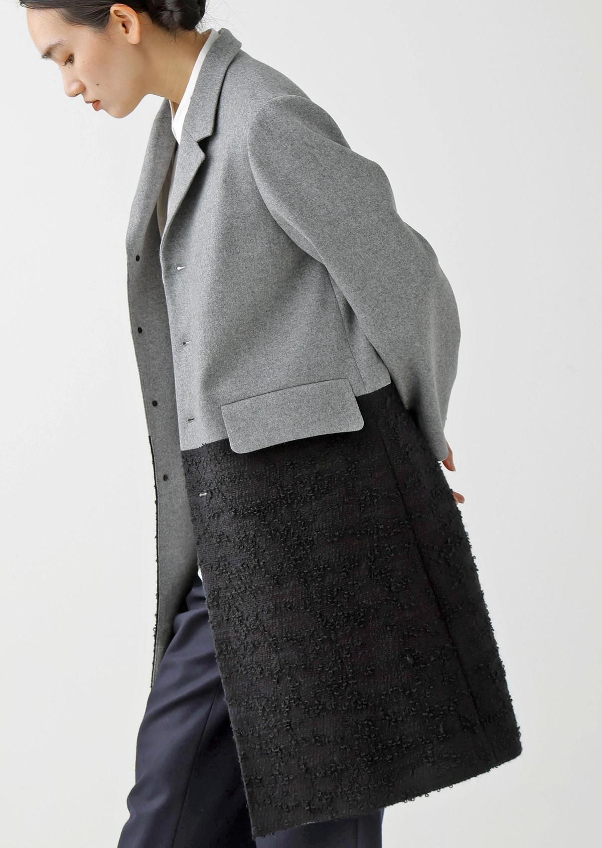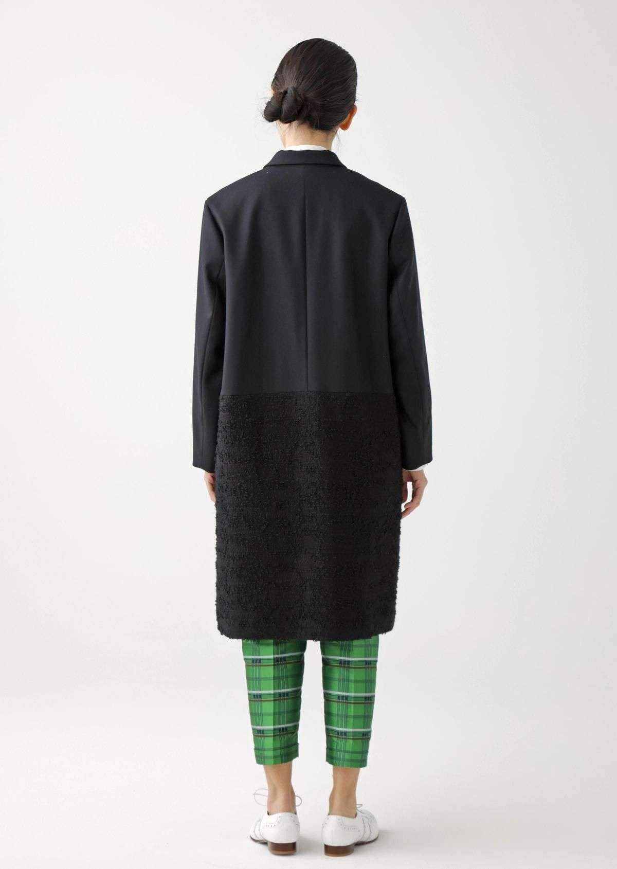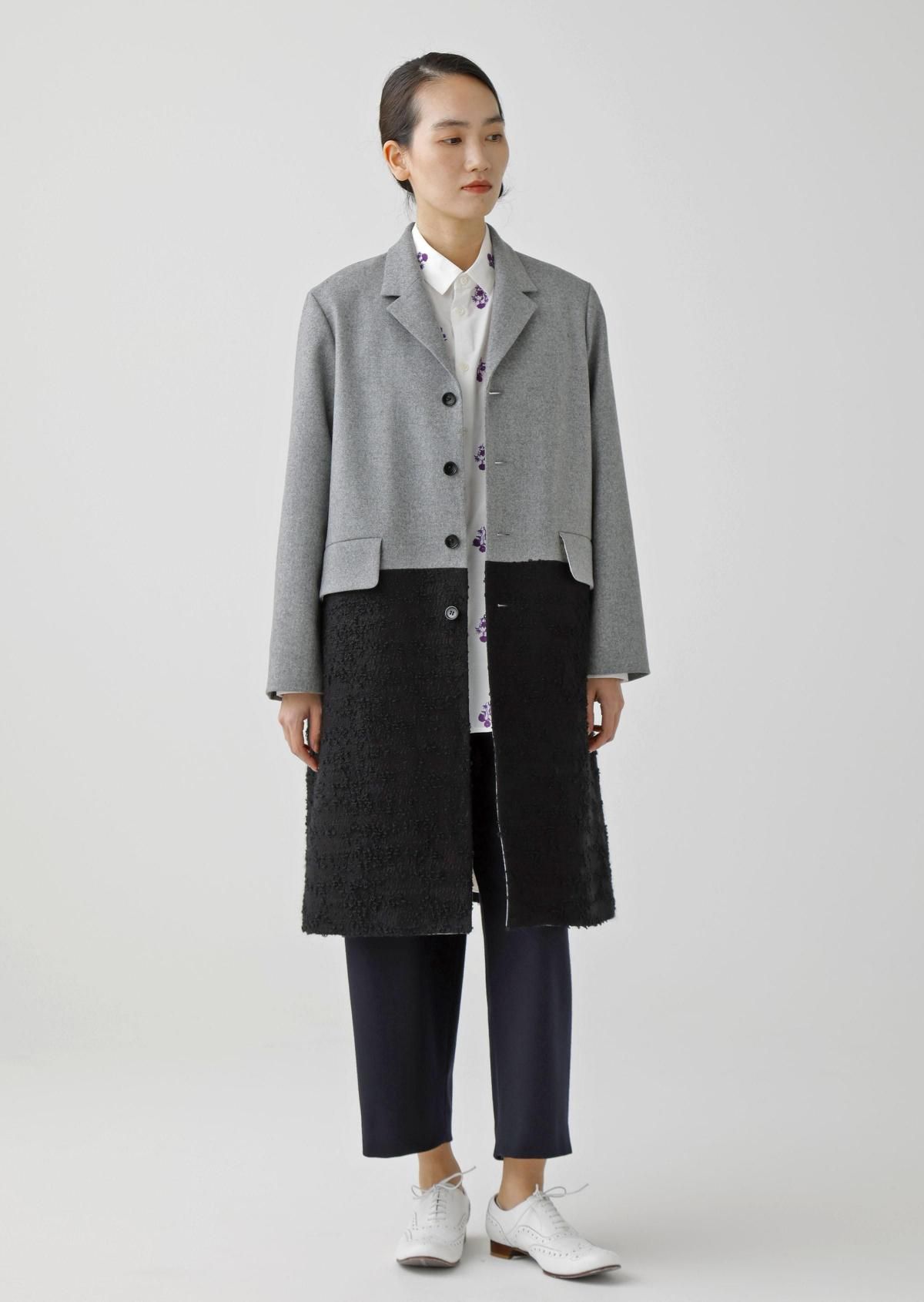 表情の異なる生地をコンビネーションしたテーラードコート。