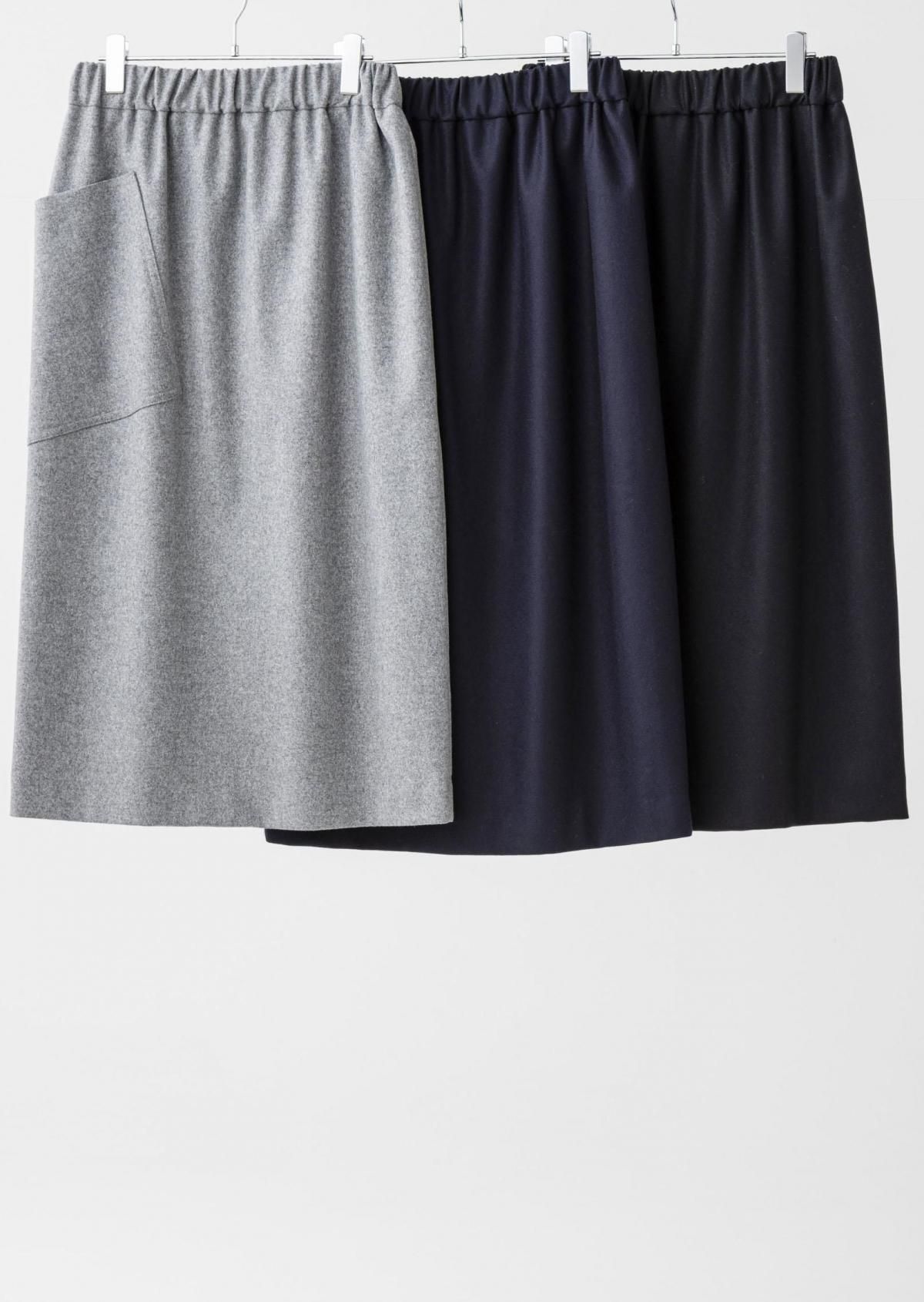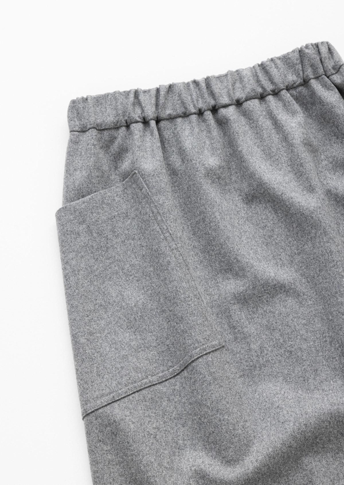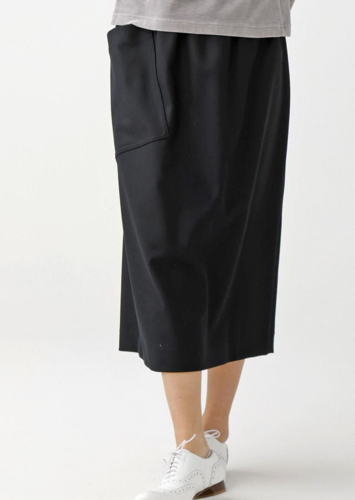 ゴムギャザーのウエストから緩やかなドレープが流れ、少し丸みを帯びたコクーンシルエットが大人の雰囲気。