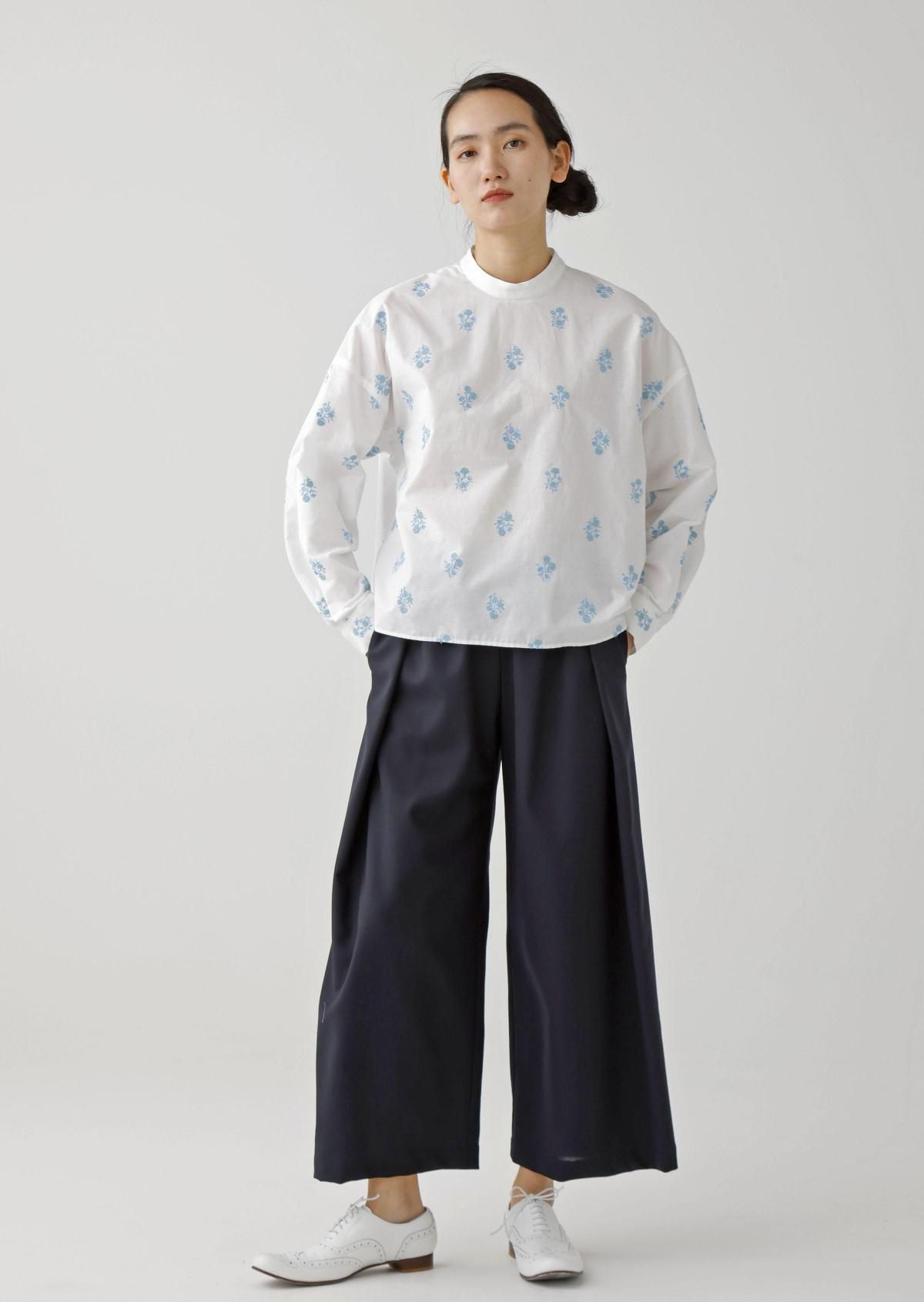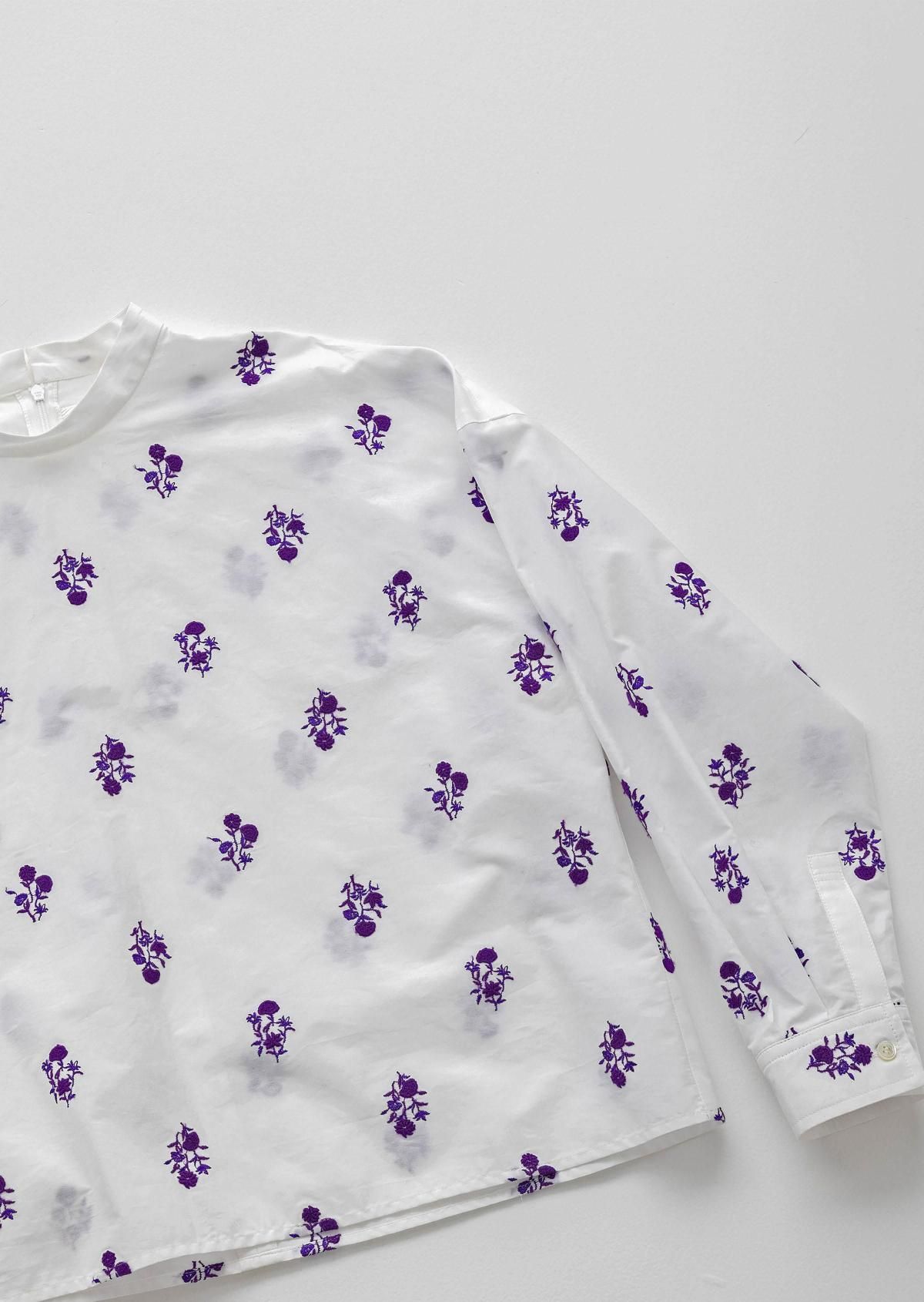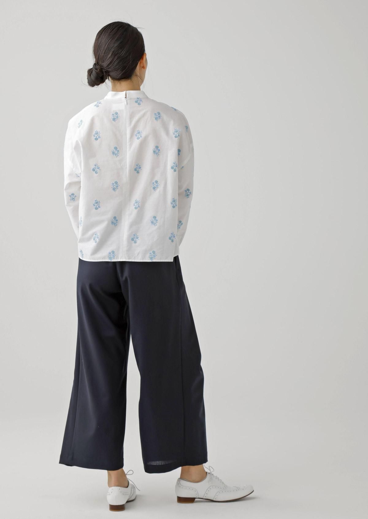 スタンドカラーのプレーンなデザインに、華やかなフラワーモチーフが映えるブラウスです。
