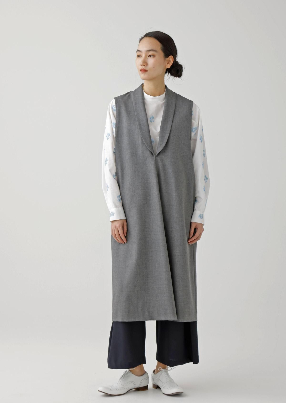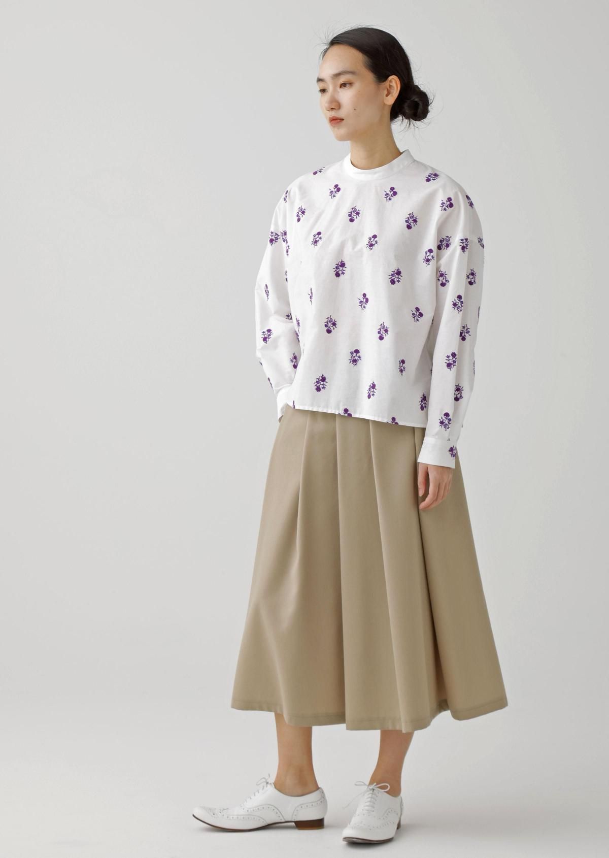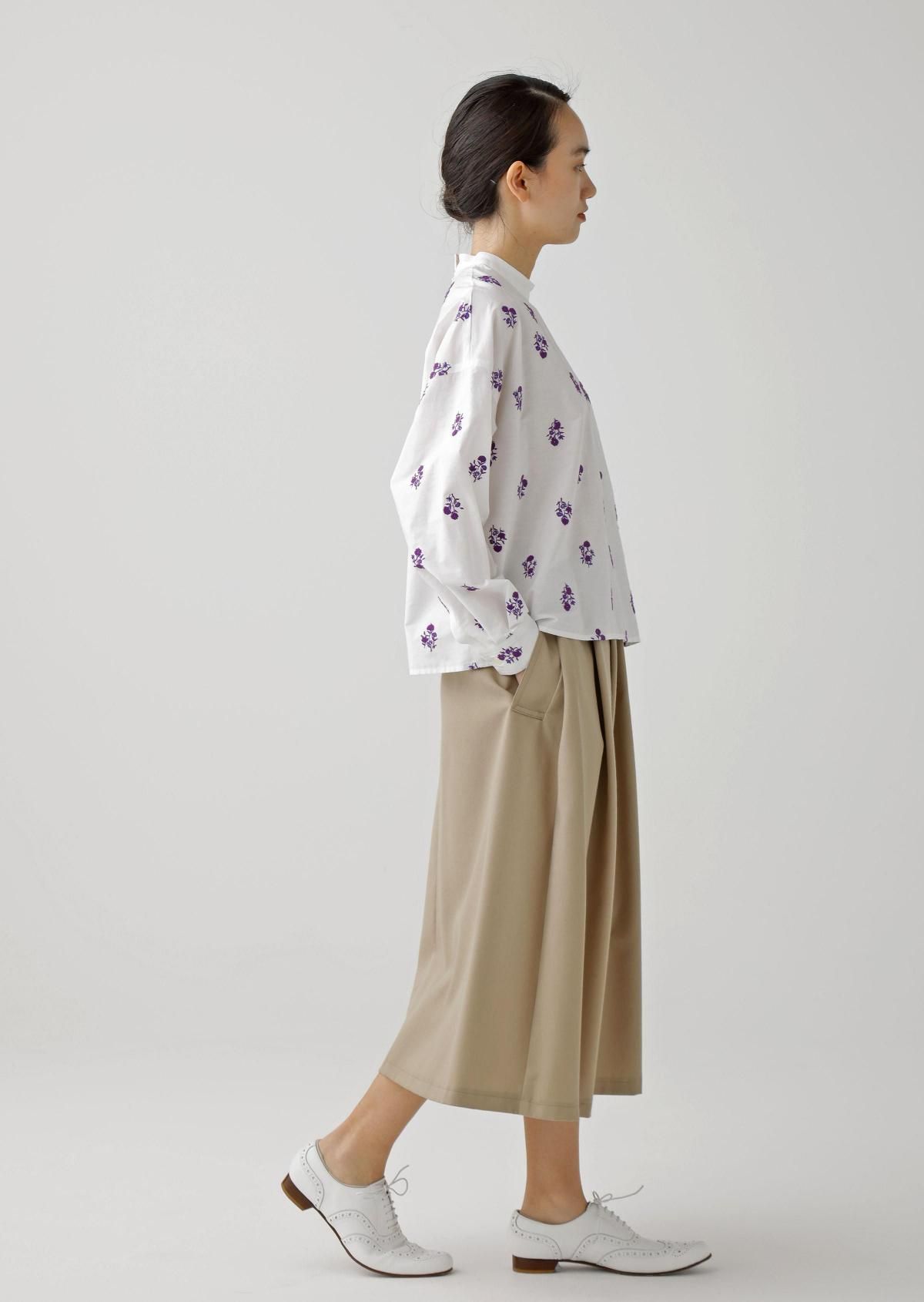 スタンドカラーのプレーンなデザインに、華やかなフラワーモチーフが映えるブラウスです。