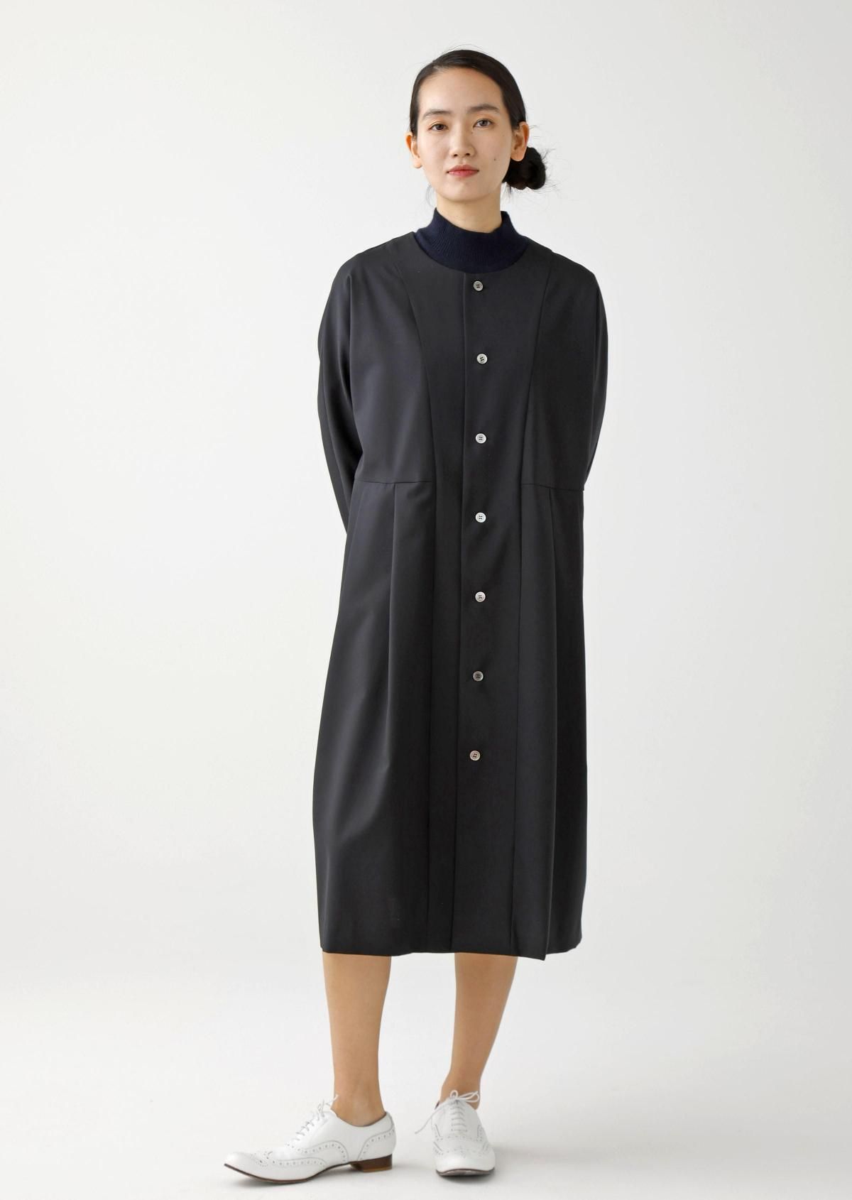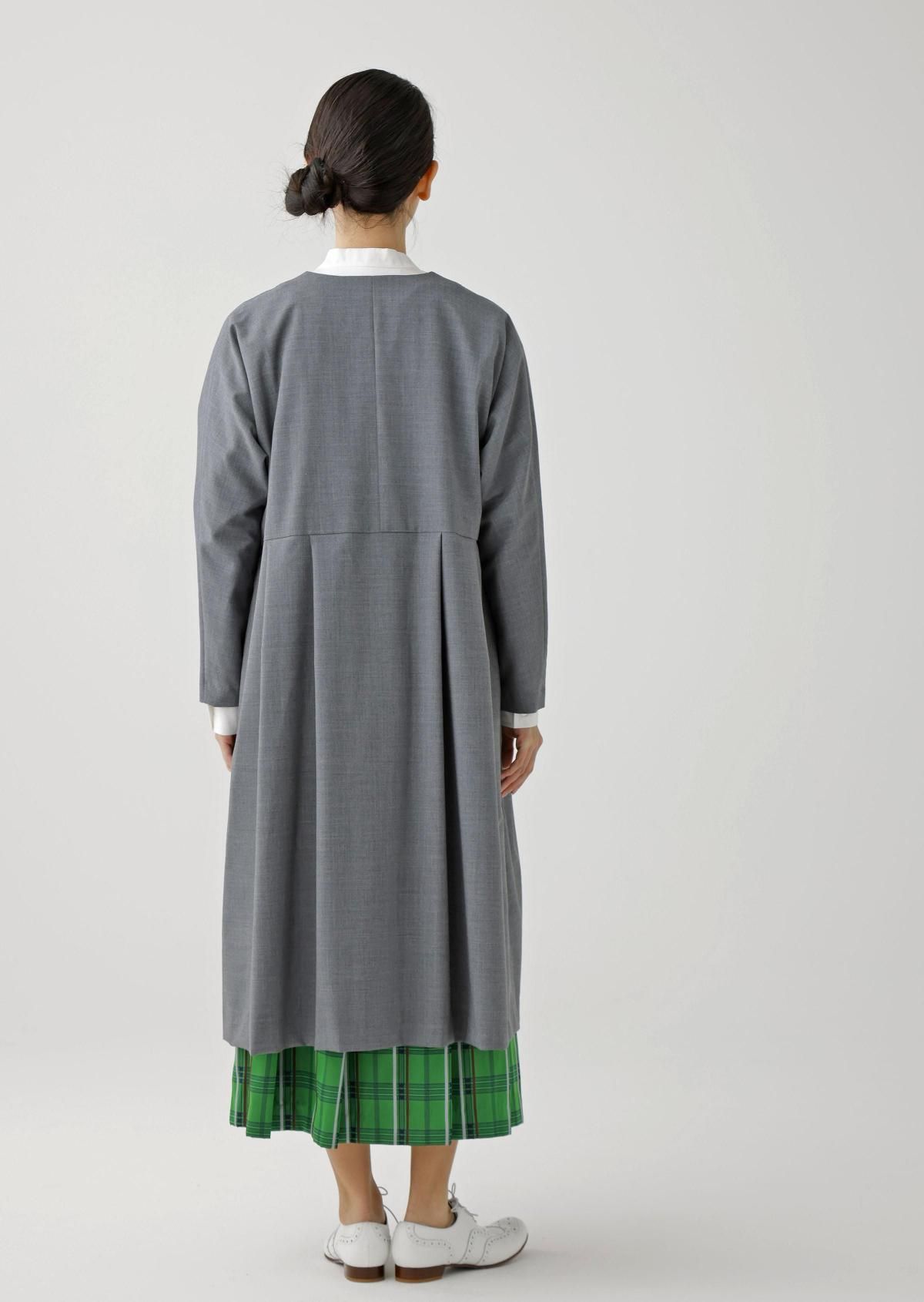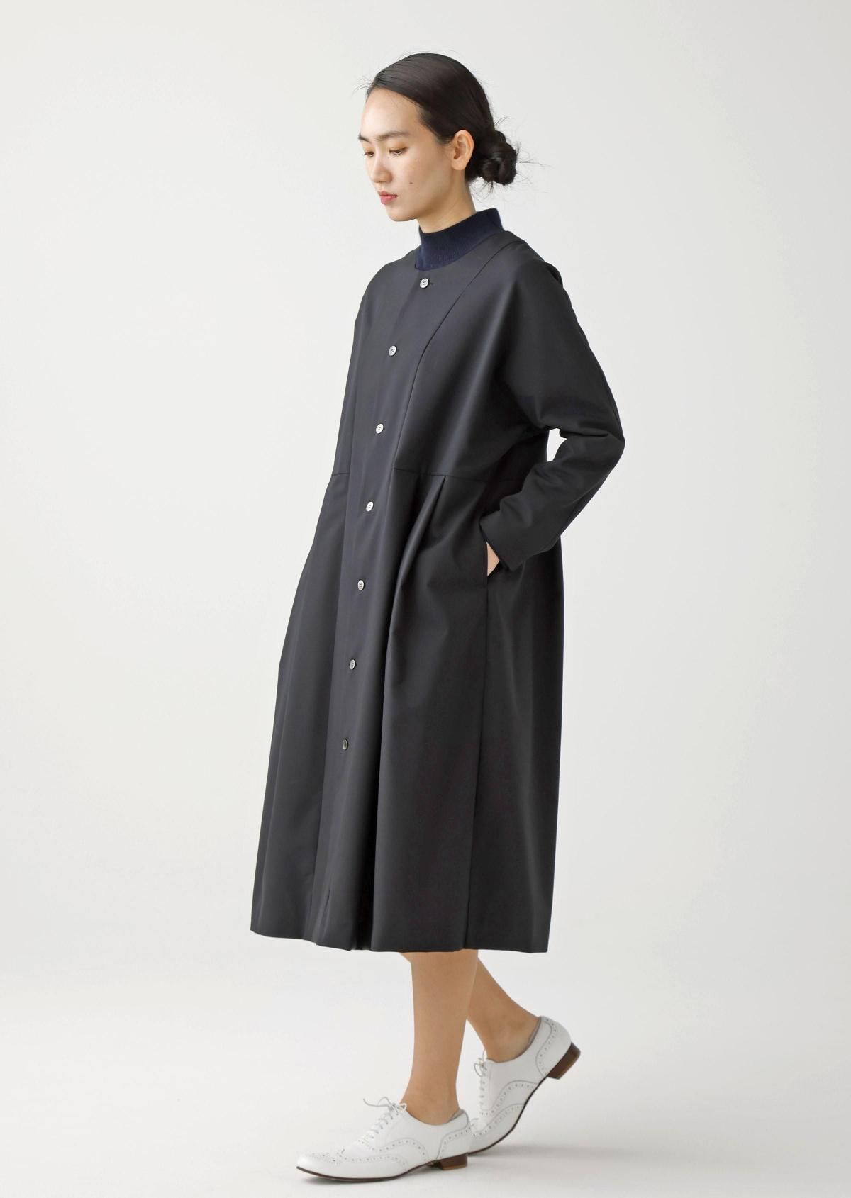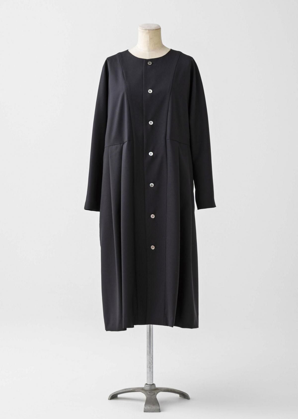 裏なしの軽い仕立てなので、季節の変わり目に薄手のコートとして、フロントボタンを閉じてワンピースとして2wayの着こなしが楽しめます。