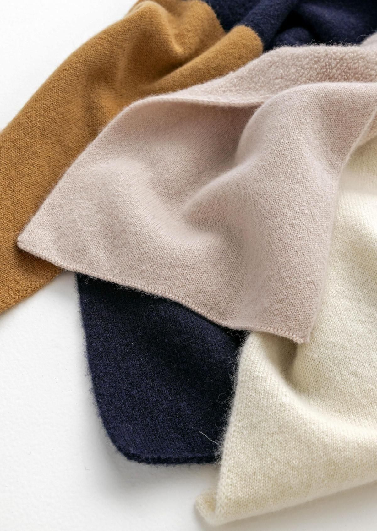 他のどのカシミア繊維よりもやわらかく暖かい糸をパイル編みにした贅沢な編み地。ずっと身につけていたくなる、とろけるような肌触りです。